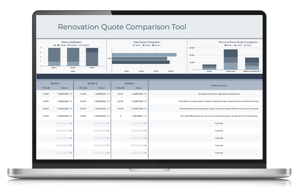 The Homeowner Toolkit is a complete set of professional planning and management tools designed to help you control costs, reduce risk, and stay organised throughout your renovation — from the first quote to final handover.
